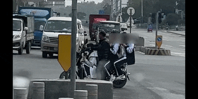 三名学生乘坐非法营运的“摩的”,有一人竟蹲坐在踏板位置,且均未佩戴头盔,与旁边的骑行者形成鲜明对比。除此之外,“摩的”驾驶人竟然还载着学生闯红灯、走机动车道,危险指数直接拉满。