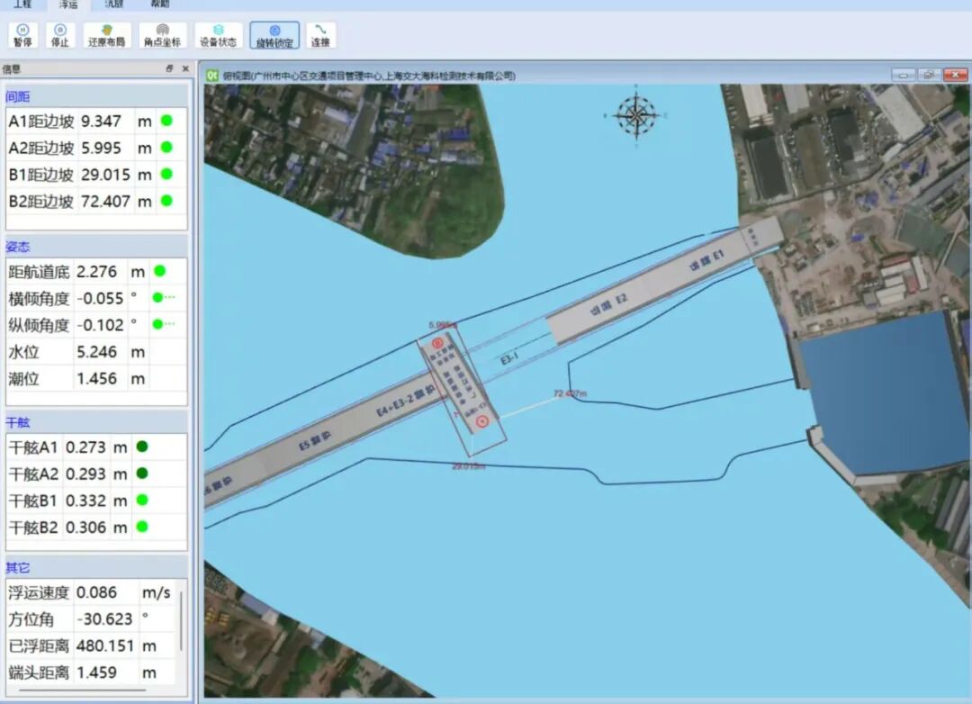 当天12时,项目建设团队核验管节浮运前的多级风险安全条件,确认各项监测数据,在确保所有指标符合要求后,管节沿着预定轨迹,开始平稳绞移至指定区域。至16时30分,管节顺利完成系泊,全程历时约4个小时。