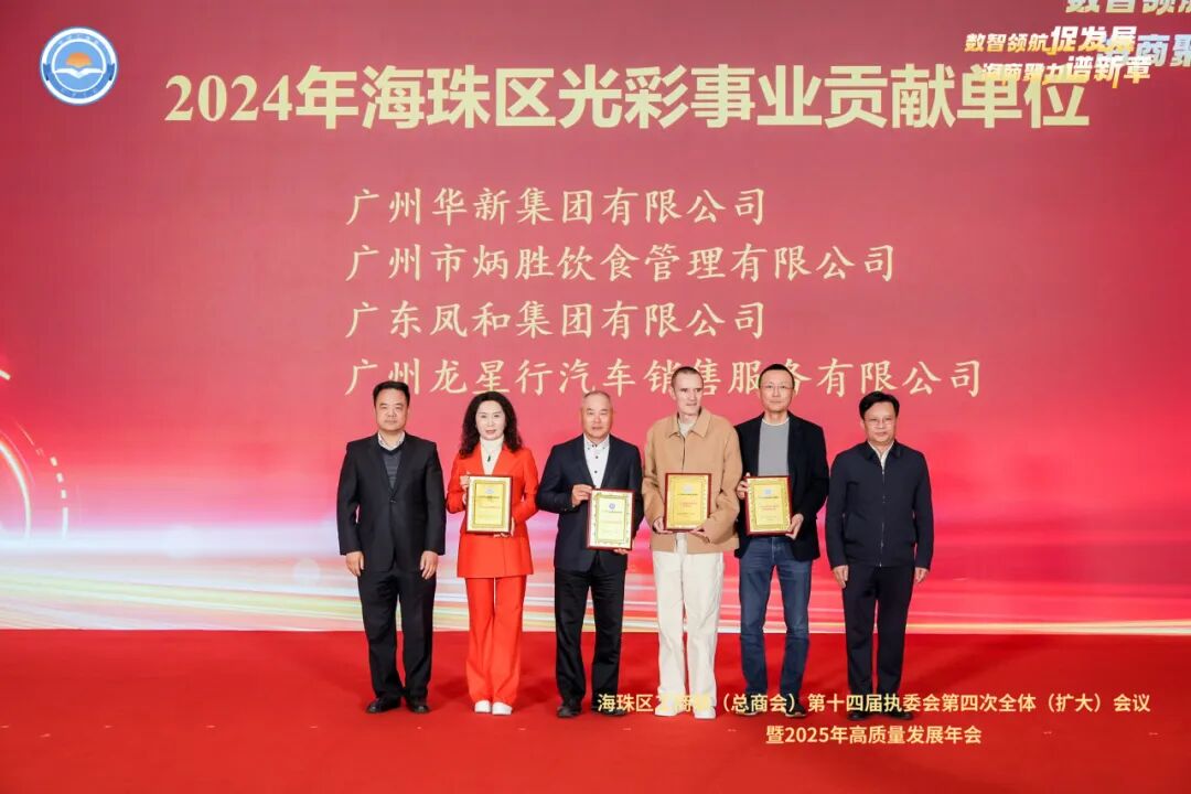 会上,表彰2024年参与消费帮扶、就业扶持、爱心募捐、助力“百千万工程”和乡村振兴工作等光彩事业的突出单位。广州华新集团有限公司荣获“2024年海珠区光彩事业贡献单位”,蔡澍书记和毛松柏区长共同颁牌。