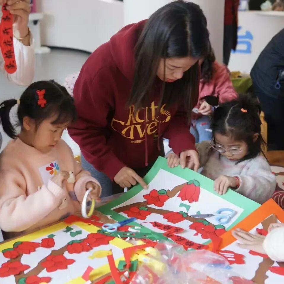 小读者和家长们兴致盎然地制作木棉花手工粘贴画