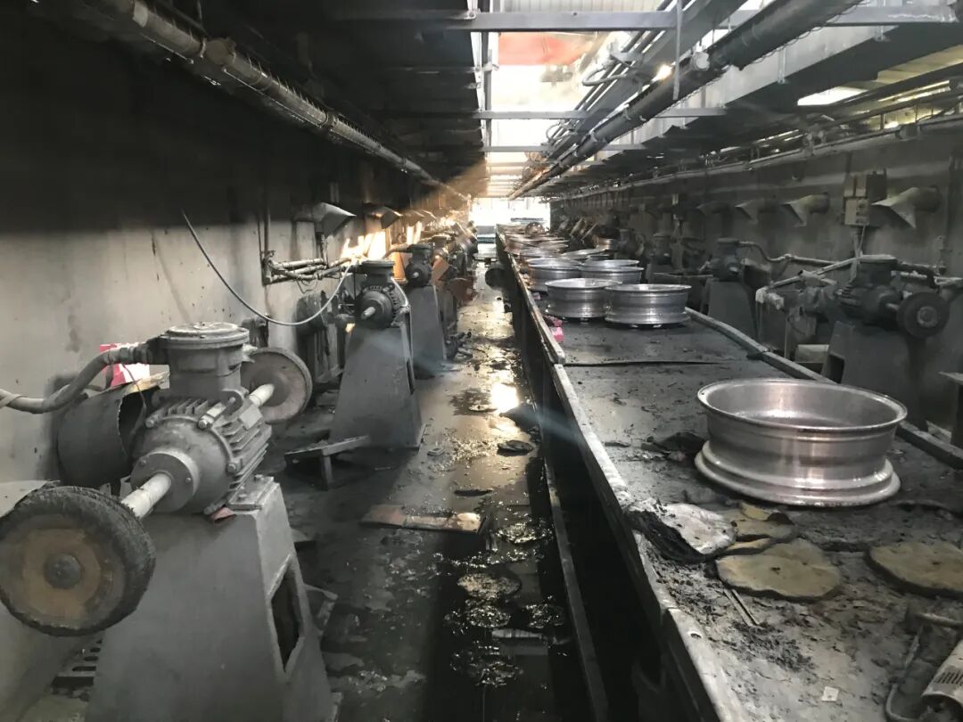 华川机械加工有限公司成立于2020年9月,注册资本200万元,占地面积约2300平方米,年产值约800万元。事发当天共有58人在现场作业,主要从事铝合金轮毂打磨抛光业务。打磨抛光产生的粉尘从下方吸风口经湿式风道进入湿式除尘器,湿式风道内每10-15分钟喷水一次,每次持续2-3分钟,打磨区域上方吸风口经干式风管进入干式布袋除尘器,干式除尘系统排风再进入湿式除尘器后排向室外。