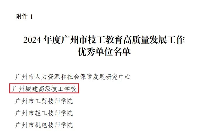 近日,广州市人力资源和社会保障局传来佳音,根据《广州市人力资源和社会保障局关于2024年广州市技工教育高质量发展工作优秀单位与优秀个人的通报(穗人社通报〔2025〕1号)》文件,广州城建高级技工学校获评2024年度广州市技工教育高质量发展工作优秀单位。