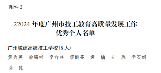 此外,学校黄秀英、梁锦彬、李俞燕、黎丽芬、袁楠、占胜、李石娟、余健8名教师荣获2024年度广州市技工教育高质量发展工作优秀个人,汤春凤、黄雨珺、郭秋红、黄丽斯4名教师荣获2024年广州市技工教育高质量发展工作优秀班主任。
