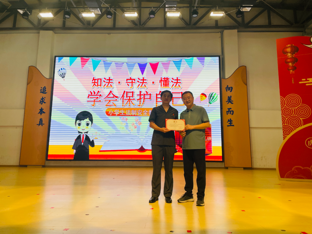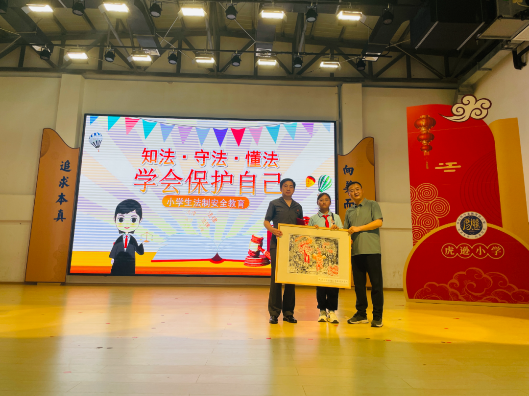 活动最后,学校党支部书记、校长黄金奇为瞿法官颁发了法治副校长聘书。六(2)班学生代表姚思琪满怀敬意地为瞿法官赠送了亲手制作的版画作品,以表师生们对法官的敬重之情。