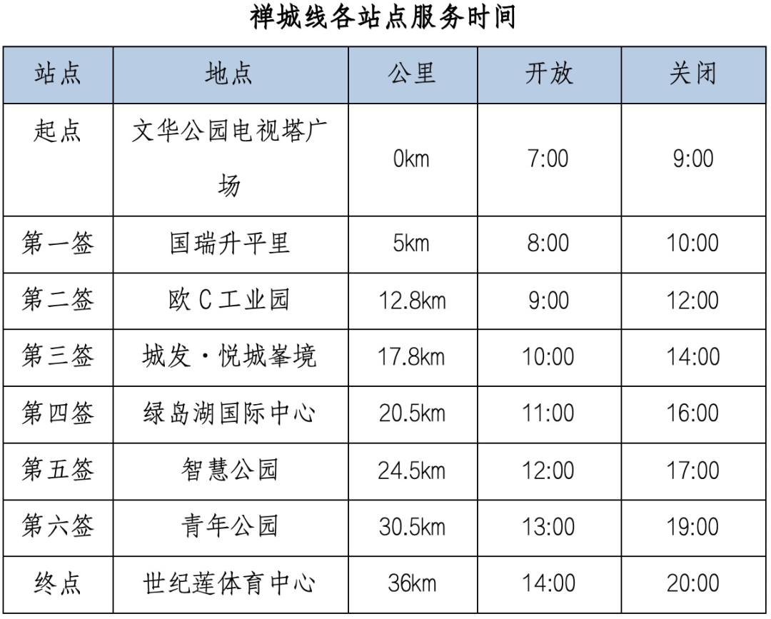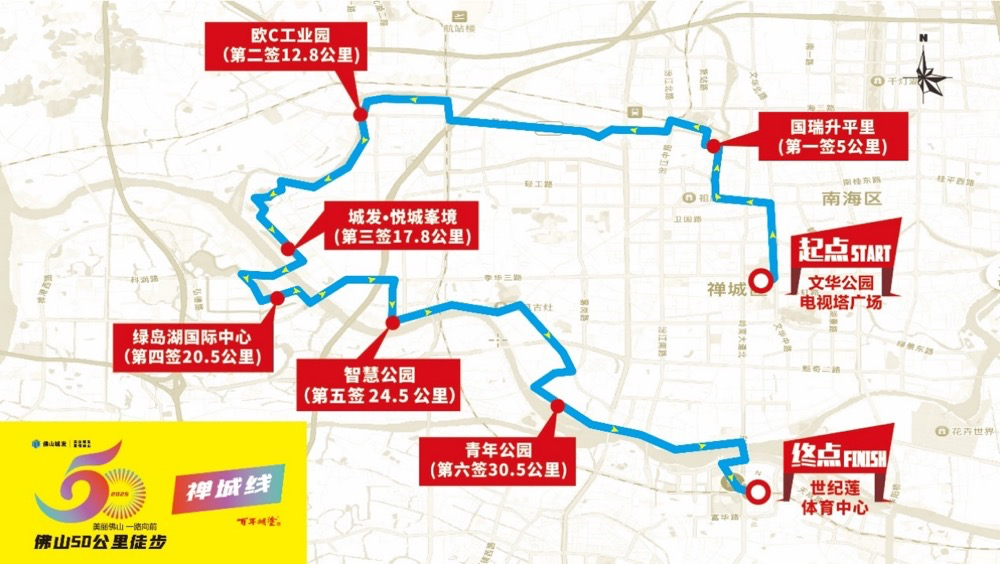 文华公园电视塔广场(起点)→文华公园东门→文华北路→兆祥路→福贤路→福䘵路→永安路→国瑞升平里(第一签5公里)→升平路→中山路→汾江桥→上沙街汾江河边绿道→塱沙路→江堤路→欧 C 工业园(第二签12.8公里)→汾江河畔绿道→华源路→王借岗森林公园→东平路→城发•悦城峯境(第三签17.8公里)→东平路→同济大桥→禅港路→科海东路→绿岛湖国际中心(第四签20.5公里)→科海东路→河堤→季华大桥→季华路→智慧新城→智慧公园(第五签24.5公里)→忠信路→高庙路→公仔街→石湾公园南门→镇中路→博远路→江滨路→青年公园(第六签30.5公里)→江滨路→东平路→东平大桥→滨河景观公园→世纪莲体育中心(终点),全程36公里。