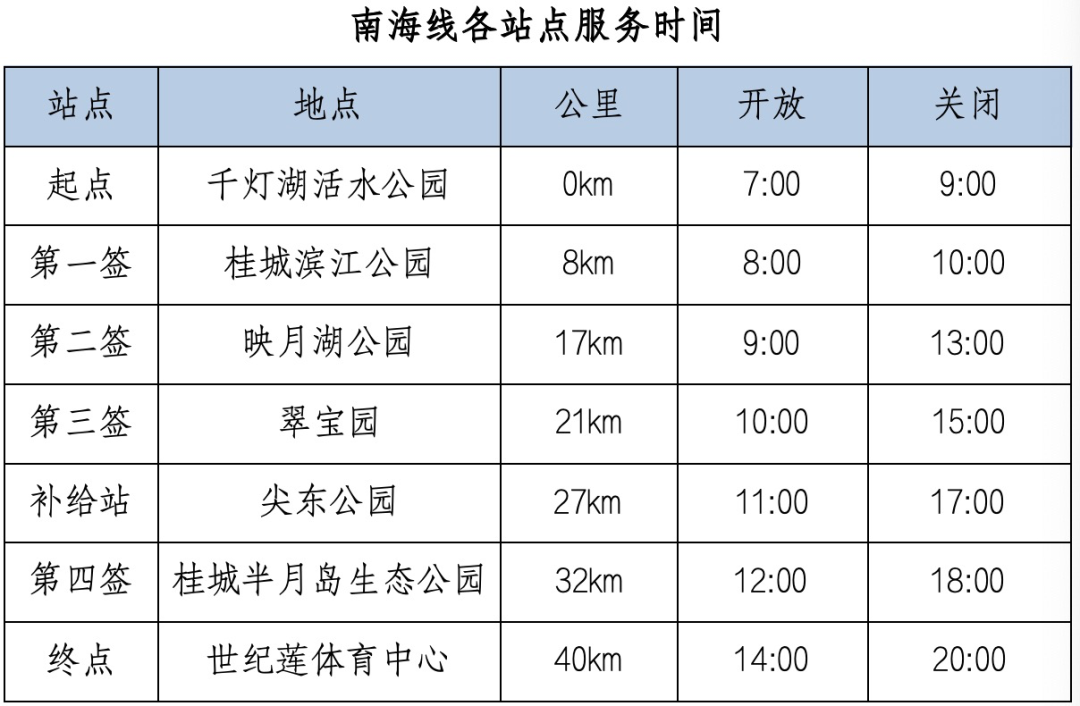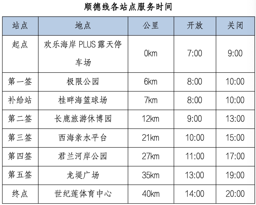欢乐海岸PLUS露天停车场(起点)→欢乐大道→桂畔水上立交→顺峰山公园桂畔湖湿地公园→紫荆岛→南国路桥底→云阳路→极限公园(第一签6公里)→桂峰路→桂畔篮球场(补给点)→桂峰路→云良桥→新市良路→田园路→长鹿旅游休博园绿地→长鹿旅游休博园(第二签12公里)→建设东路→建设南路→河堤路→西海大桥→顺北群力→Y324→西海亲水平台(第三签21公里)→Y324→林头大桥→105国道→Y109→君兰河岸公园(第四签27公里)→Y109→始兴码头→龙堤广场(第五签35公里)→佛山新城绿道→世纪莲体育中心(终点),全程约40公里。