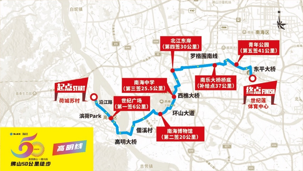 荷城苏村(起点)→苏村大道→秀丽路→沿江路→滨江湿地公园→滨荷Park生态文创园→荷城公园→世纪广场(第一签6公里)→灵龟公园→高明大桥(旧桥)→龙高路(加油站)→新田村健身步道→樵高路(海舟三乡路口)→儒溪村→环山大道→南海博物馆(第二签20公里)→环山花海→环山绿道→山根新村→南海中学(第三签25.5公里)→西樵大桥→北江东岸(第四签30公里)→沿江路→南庄一桥→南乐大桥桥底(补给点37公里)→罗格围南线→洲尾围生态公园→凤翔大桥→江滨路→青年公园(第五签41公里)→江滨路→东平路→东平大桥→滨河景观公园→世纪莲体育中心(终点),全程约46.5公里。
