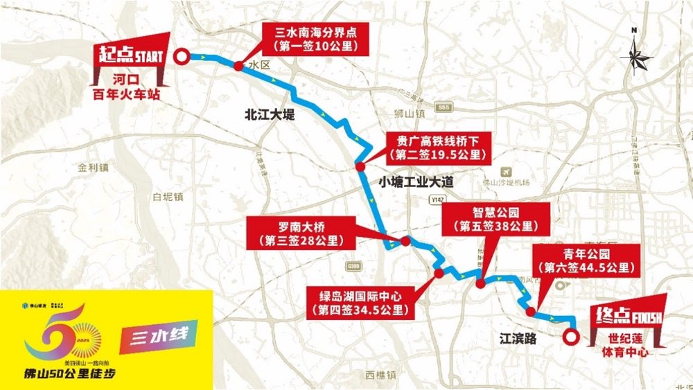 河口百年火车站(起点)→车仔路→北江大堤→威斯汀足球基地→北江体育休闲公园→北江大堤→西南水闸→北江大堤→三水南海分界点(第一签10公里)→北江堤围→沈海高速桥底→512县道→唐西路→贵广高铁线桥下(第二签19.5公里)→小塘工业大道→佛山大堤→罗南大桥(第三签28公里)→河堤→同济大桥底→禅港路→科海东路→绿岛湖国际中心(第四签 34.5公里)→科海东路→河堤→季华大桥→季华路→智慧新城→智慧公园(第五签 38 公里)→忠信路→高庙路→公仔街→石湾公园南门→镇中路→博远路→江滨路→青年公园(第六签 44.5 公里)→江滨路→东平路→东平大桥→滨河景观公园→世纪莲体育中心(终点),全程约 50 公里。