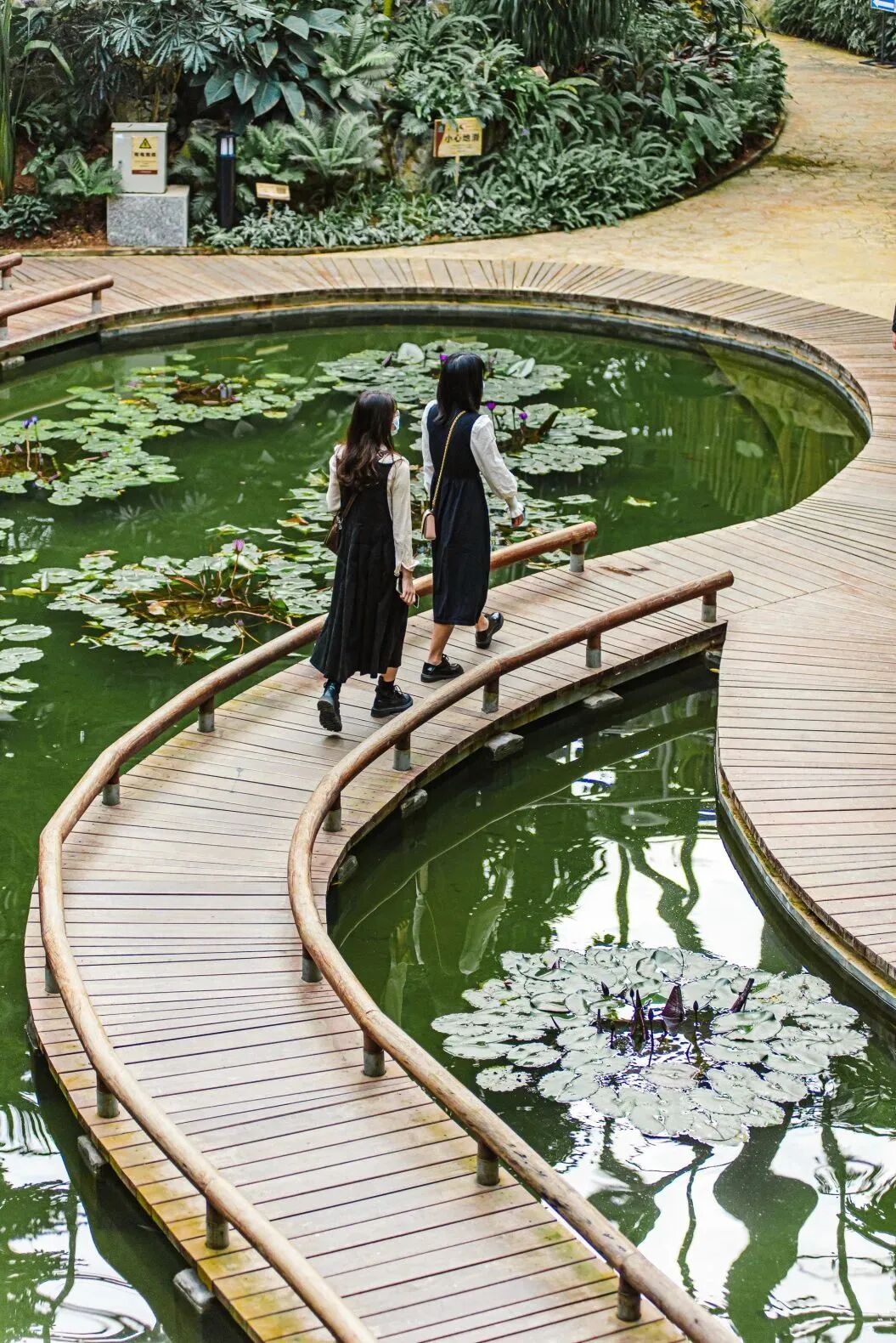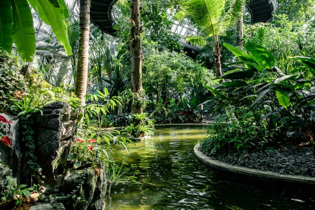 小山、瀑布、木栈桥、池水...构成了别具一格的温室空间,置身其中,仿佛身处一片热带雨林,任意一个角度拍照,都可以称为一组“大片”!