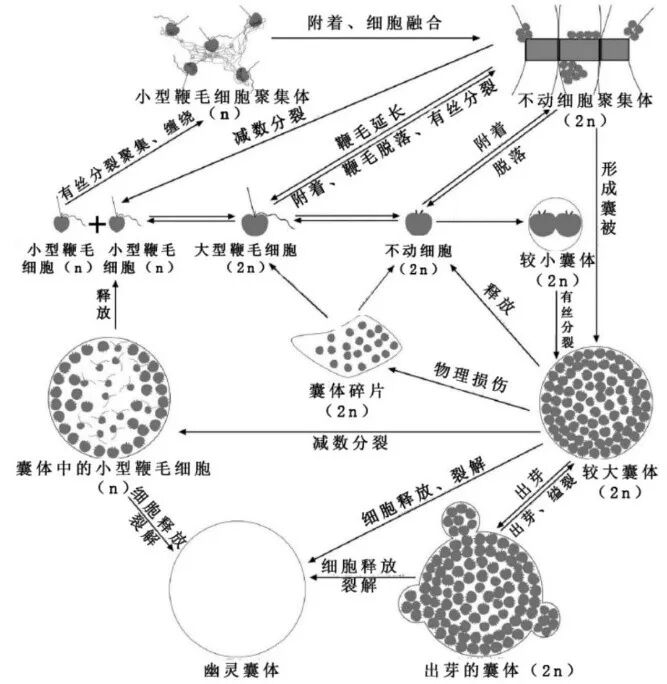 球形棕囊藻具有复杂的异型生活史,不同形态的游离单细胞可以通过分泌多糖基质形成从微米到厘米级大小不等的凝胶状囊体。单细胞状态时,由鞭毛提供运动能力,个个都是“精兵强将”;囊体状态时,完美适应大军团作战,像是一座座移动的堡垒,在海洋生态系统中占据优势地位。囊状群体所赋予的竞争优势是球形棕囊藻能够频繁形成大规模赤潮的一个重要原因。