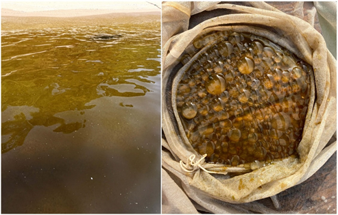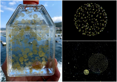 ▲ 现场和显微镜视角下的球形棕囊藻