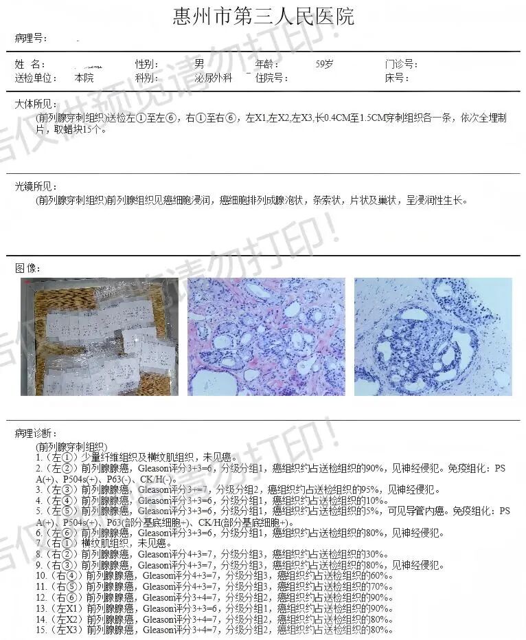 接诊他的杨伟忠主任仔细看了报告,发现黄叔的前列腺特异性抗原(PSA)明显升高。经过直肠指检后,杨主任建议黄叔住院进一步检查。最终,通过前列腺穿刺活检,黄叔被确诊为前列腺癌。