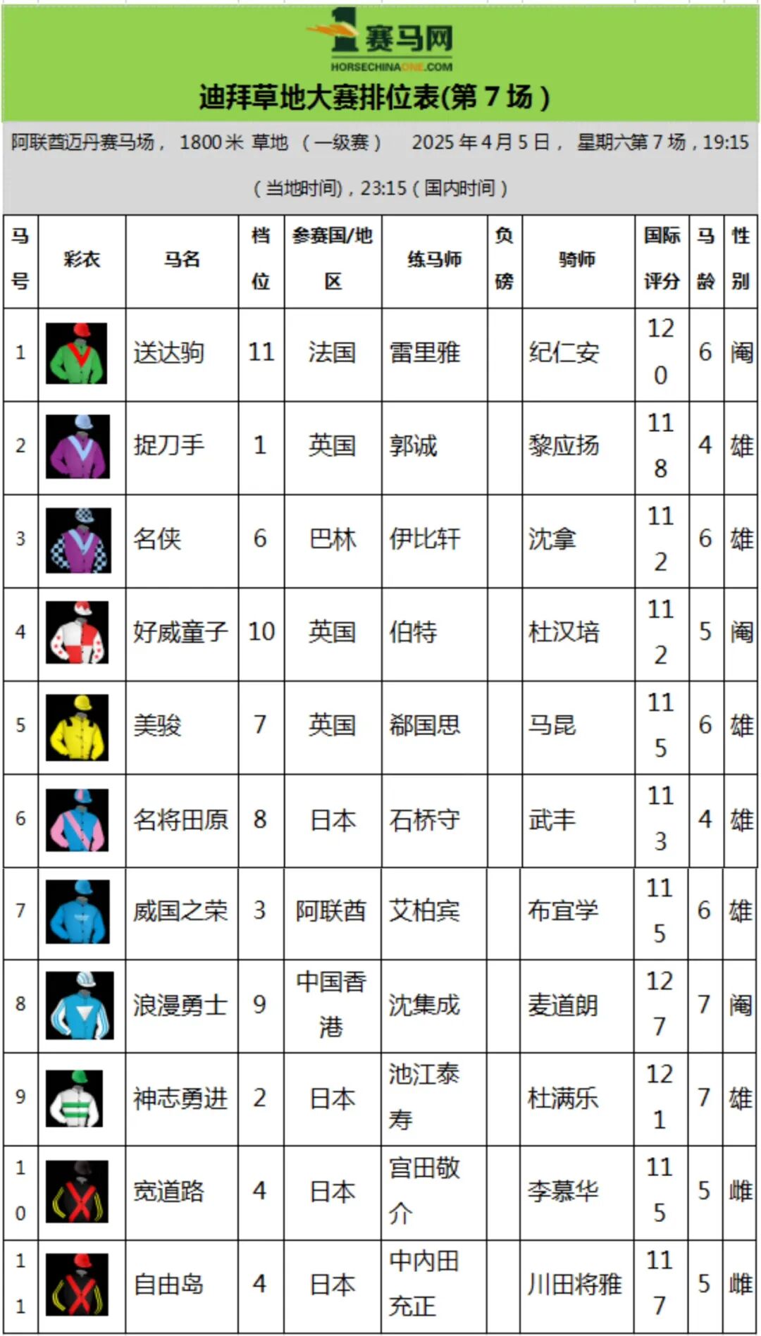 备受大家关注的现全球累积奖金最多的赛驹、中国香港马王“浪漫勇士”将在国内时间2025年4月6日凌晨00:15分身披8号马衣从第9号闸出战第7场迪拜草地大赛(1800米草地一级赛)。