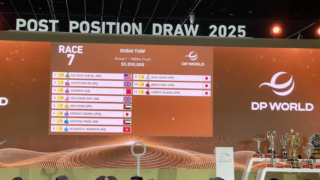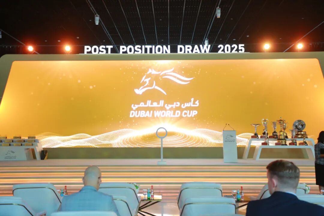 2025年4月2日迪拜时间上午11时,第29届迪拜赛马世界杯比赛日5场一级赛的排位抽签仪式在迈丹酒店举行。迪拜马会宣布,由于4月5日当天的天气原因,所有场次的比赛将顺延1个小时举行。来自13个国家和地区的104匹佳驷将为3050万美元(约合人民币2.2亿元)的总奖金展开激烈角逐。