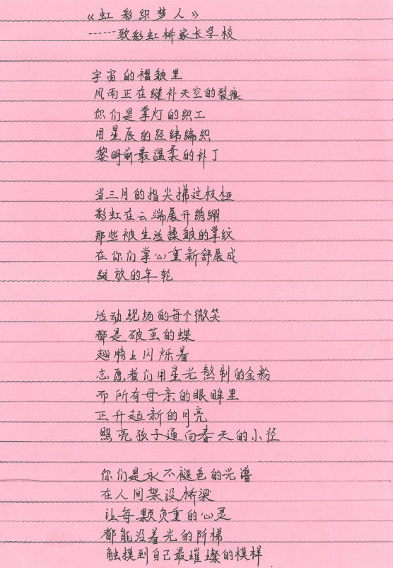 台灯下,她写下诗句:“宇宙的褶皱里/风雨正在缝补天空的裂痕/你们是掌灯的织工……”这首诗献给“彩虹桥家长学校”——2024年5月以来,花都区陆续落地全国首家“彩虹桥家长学校”、首台“星星幸福舱”等公益项目,为孤独症儿童家庭提供支持,并帮助“星星妈妈”们灵活就业、重拾自我。