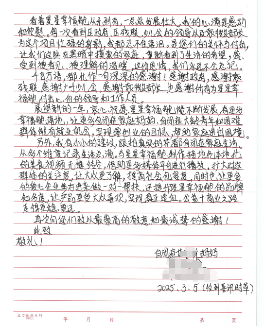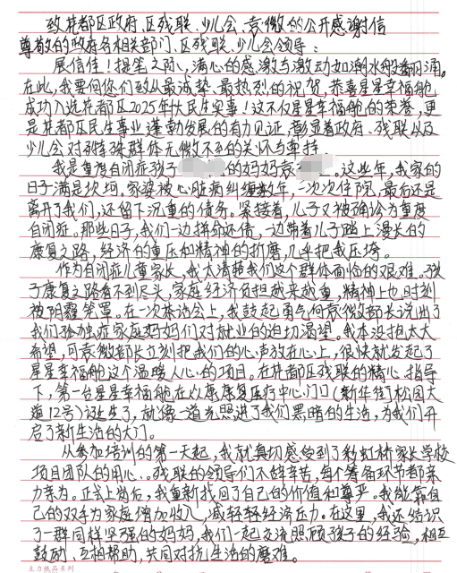 “星星妈妈”袁珍金写给花都区政府、区残联、广州市少儿会、袁微的感谢信↓