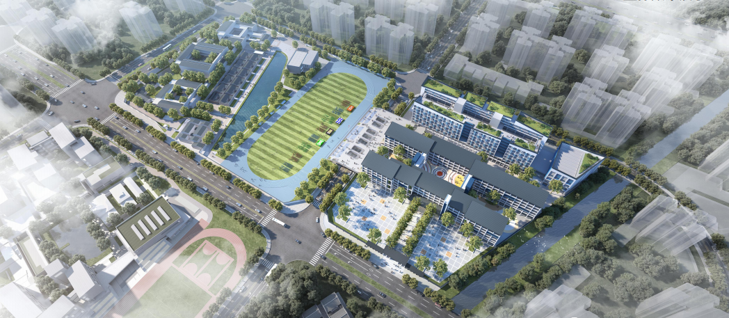 高中部项目总建筑面积62744.27㎡,以“岭南书院·未来学园”为设计理念,融合传统书院格局与现代教育功能,配备智慧教室、科创实验室、多功能报告厅、标准运动场馆及高标准学生公寓,全面构建“教、学、研、居”一体化的智慧校园生态。