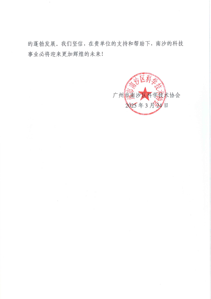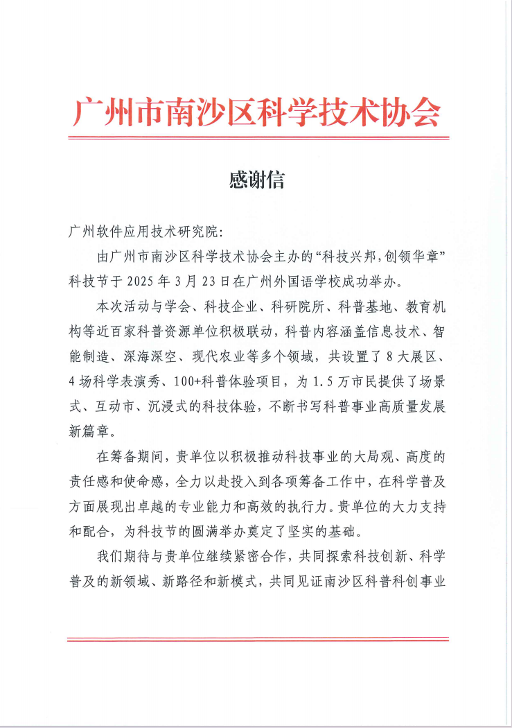 近日,广州软件应用技术研究院(简称:广州软件院)收到广州市南沙区科学技术协会(简称:南沙科协)发来的感谢信。信中,南沙科协对广州软件院在“科技兴邦 创领华章”科技节中的专业贡献与创新实践给予了高度评价,尤其对其在青少年科普教育领域的深度探索与技术支持表示衷心感谢。