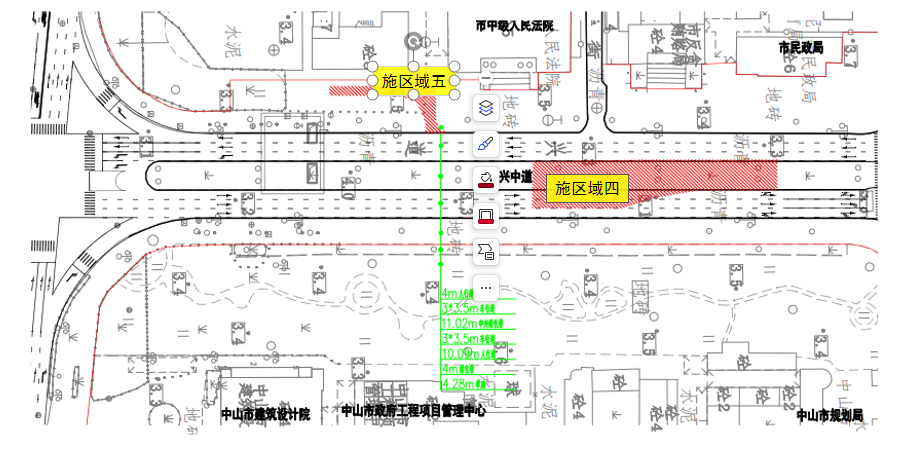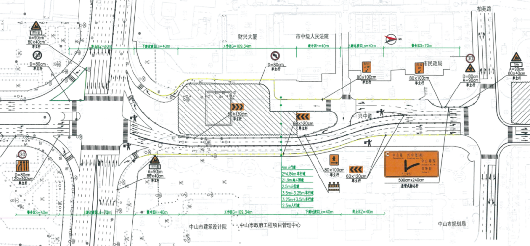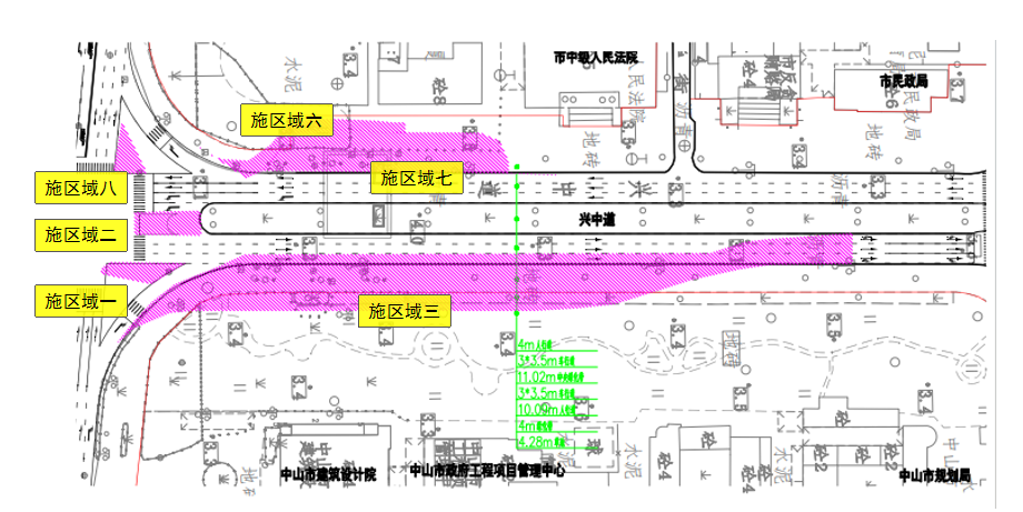 围蔽范围:兴中道柏苑路至中山三路段部分中央绿化带、渠化岛、人行道、路边花基及部分机动车道。