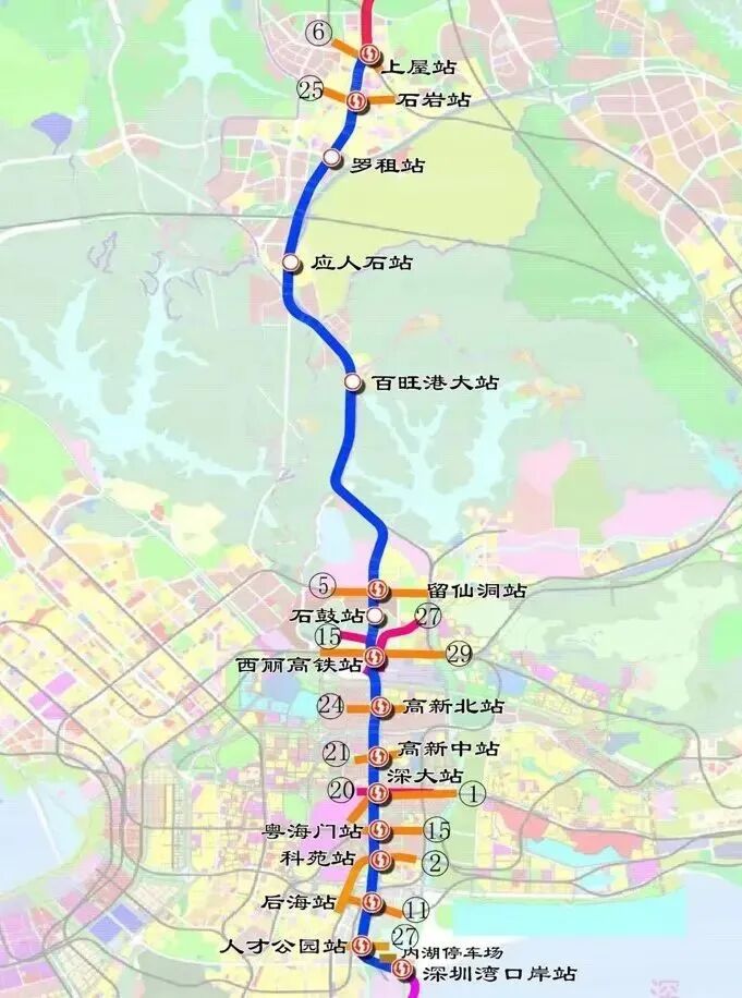 其中,一期工程起于深圳湾口岸站,途经南山区、宝安区,止于上屋站。