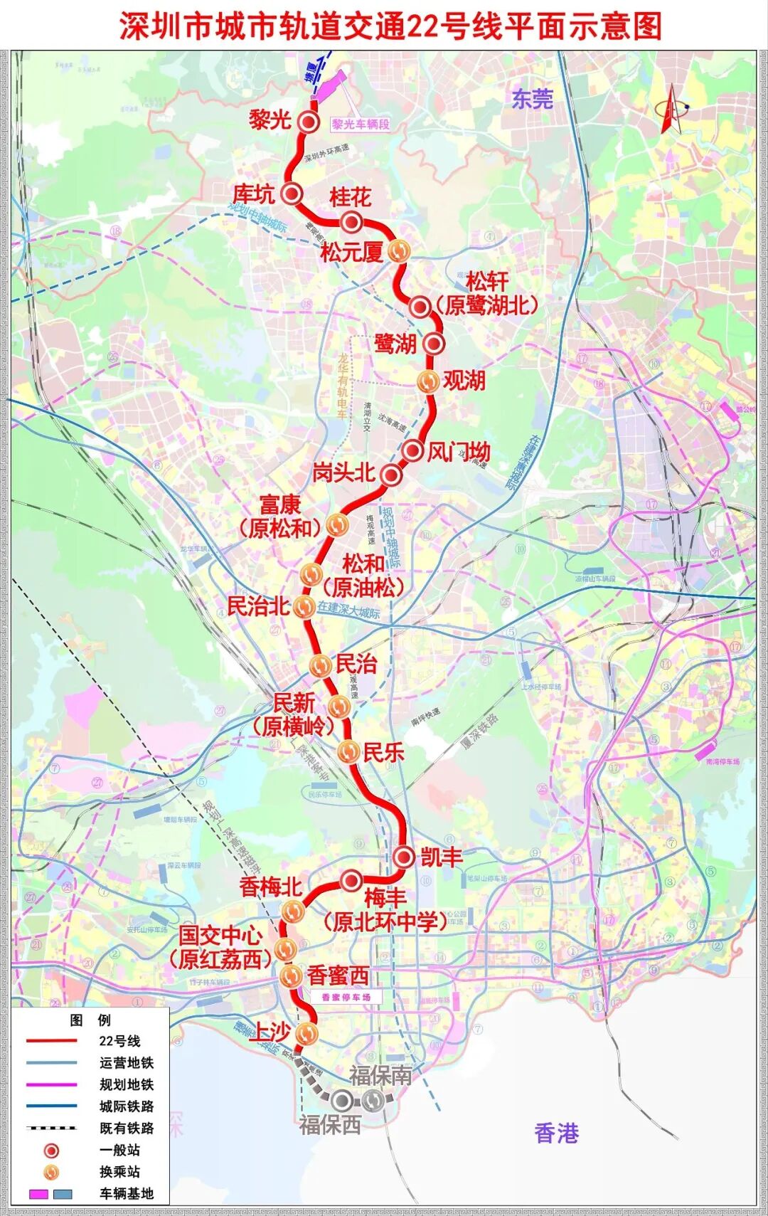 22号线一期工程起于上沙站 ,途经福田区、龙岗区、龙华区,终至黎光站,线路全长34.7公里。