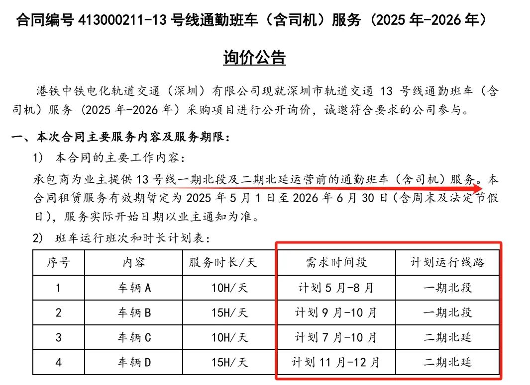 近日,港铁深圳在官网公布了《13号线通勤班车(含司机)服务 (2025年-2026年)询价公告》。