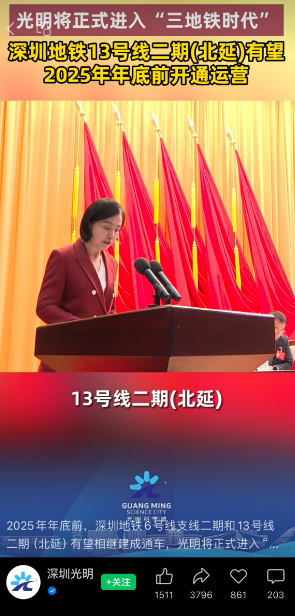 此前,在光明区二届三次党代会上,官方曾宣布2025年年底前,轨道6号线支线二期、13号线二期(北延)有望相继建成通车,届时,光明全区地铁总里程将翻一番,增至47.5公里,光明将正式进入“三地铁时代”。