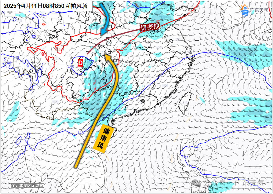 预计10日到11日白天,偏南气流加大,广东处于辐散气流中,大部以多云天气为主,韶关、清远和肇庆有分散雷阵雨,气温继续上升,能量持续累加。