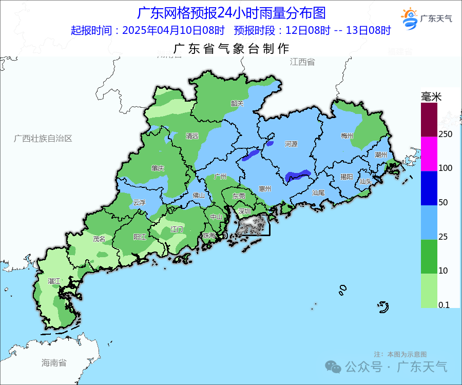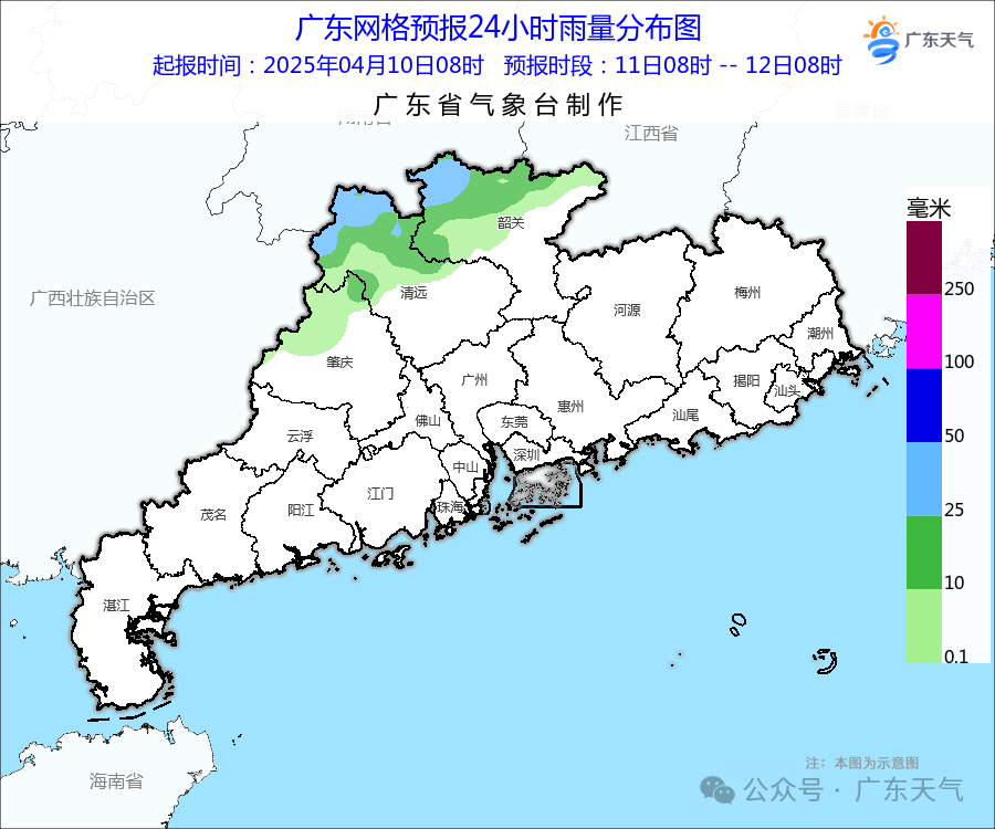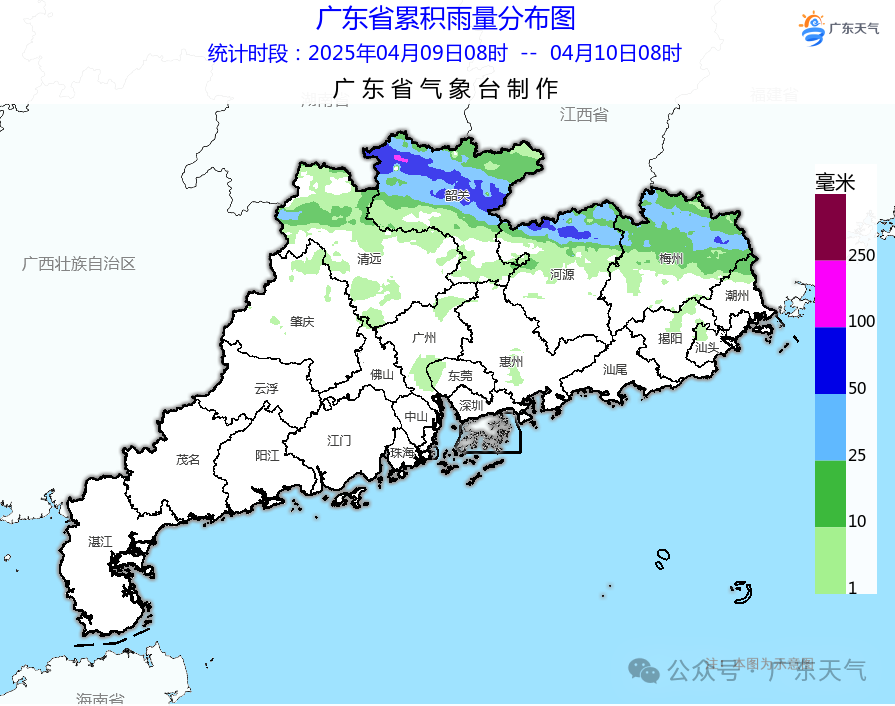 4月9日到4月10日早晨,广东的雨主要下在清远、韶关、河源、梅州的偏北市县,乐昌24小时最大累计雨量超过100毫米。