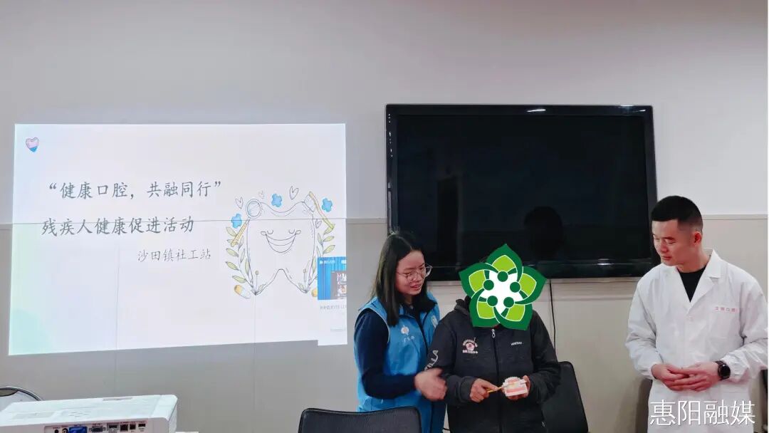 日前,沙田镇“双百”社工站联合惠阳文信口腔、同愿同行志愿者、“双百”志愿者在沙田镇康园中心开展“健康口腔,共融同行”残疾人健康促进活动。旨在普及口腔疾病防控知识,提高残疾人的口腔保健意识。