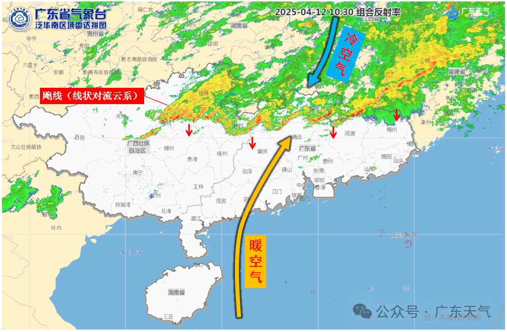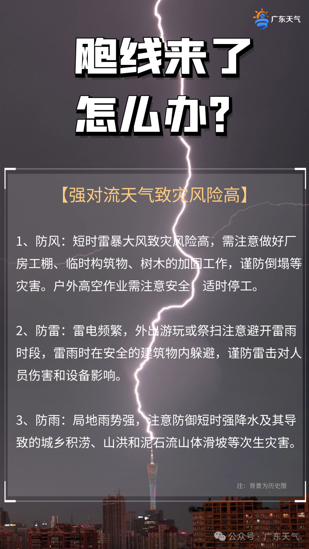 今天(4月12日)上午,一条宽广的雨带(线状对流云系)开始影响广东的北部,带来雷暴及7~9级局地10~12级的短时大风。预计今天广东大部先后有雷暴大风、短时强降水、局地冰雹等强对流天气。13日起转多云到晴。另外,受冷空气影响,12-13日各地气温陆续下降3~7℃,注意添衣。