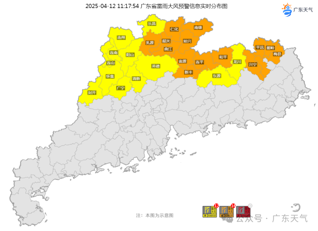 截至12日11时17分,肇庆、清远、韶关、河源、梅州等26个市县发布了雷雨大风预警信号,其中韶关、河源、梅州等14个市县发布雷雨大风橙色预警信号。