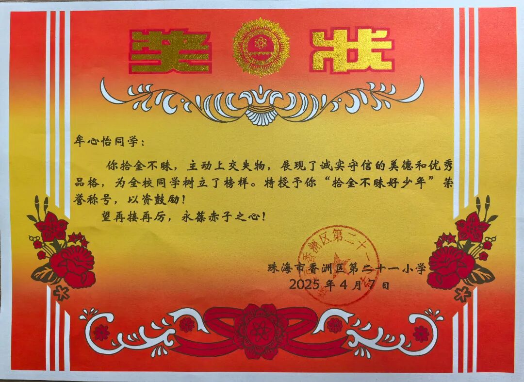 4月7日,于香洲区第二十一小学的周一升旗仪式上,在全校师生的见证下,珠海市香洲二十一小教育集团总校长、珠海市香洲区第二十一小学党总支书记邬文娟为牟同学颁发了“拾金不昧好少年”奖状,台下掌声如潮。