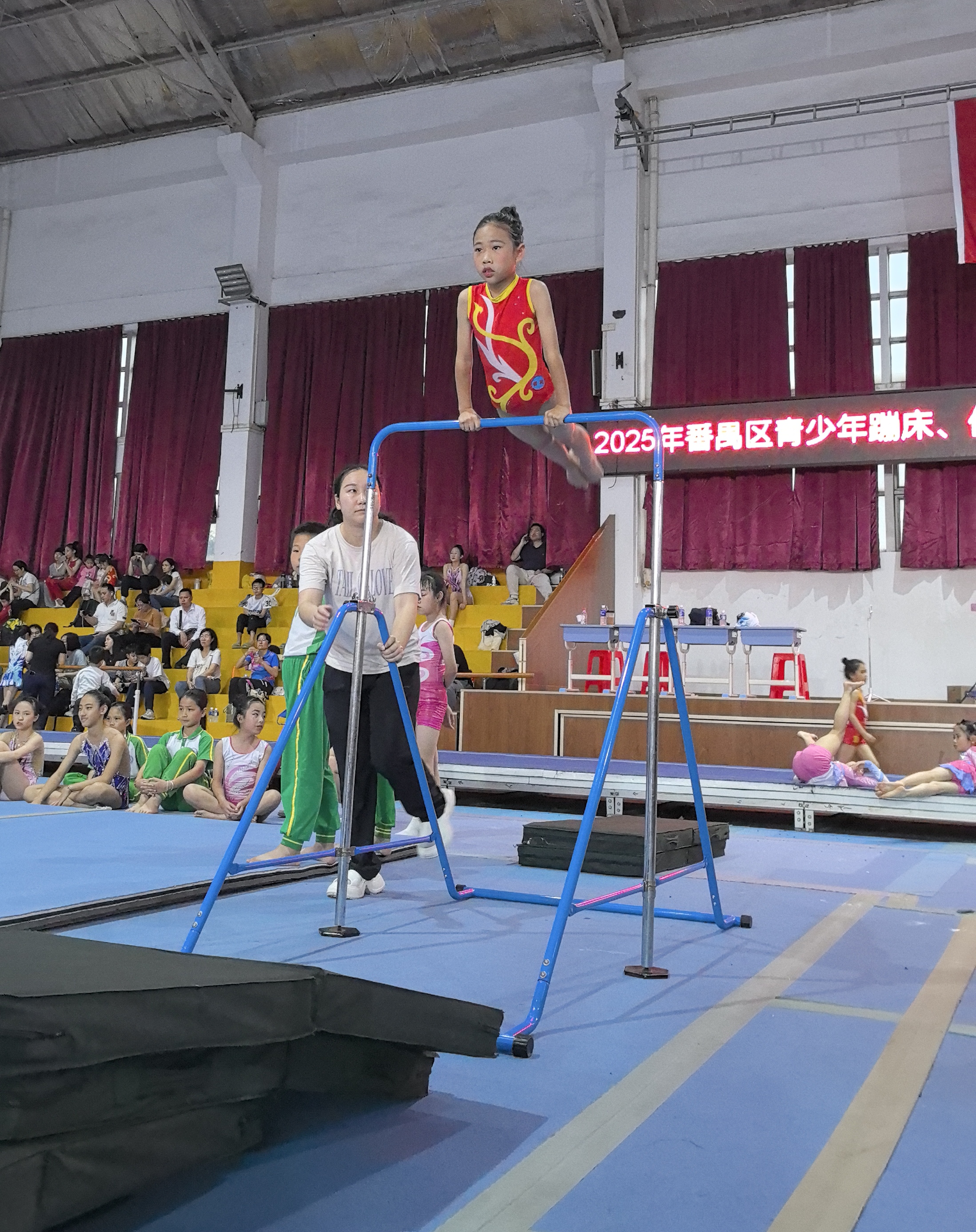 番禺体校蹦床体操教练沈明英透露,本次赛事是选拔广州市运会参赛选手的关键节点,“我们重点观察运动员的爆发力、空中姿态控制和心理素质。比如幼儿组选手在完成动作时的表情管理,是否能在紧张环境下保持专注,这些都是潜在的选材指标。”她还提到,近年来体校与多所学校建立“双向培养”机制,教练定期入校指导,学校则输送有潜力的学生进入体校集训。