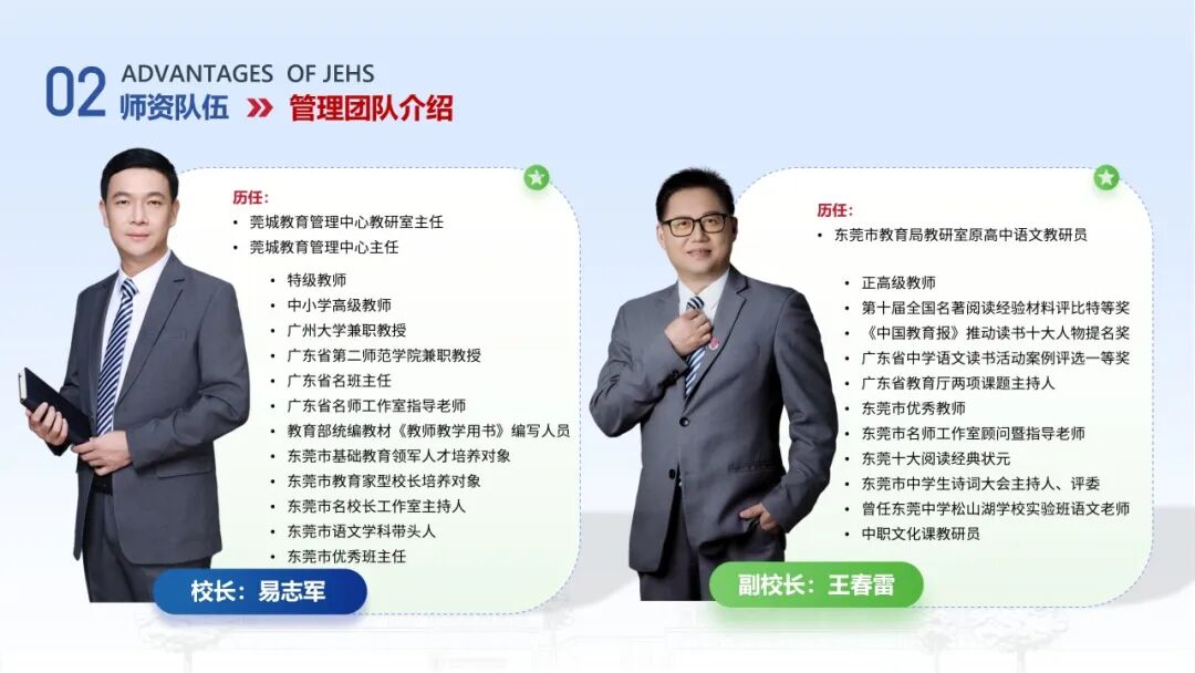 嘉实拥有雄厚的师资力量,依托嘉荣教育集团优质资源,由特级教师、东莞市基础教育领军人才培养对象、东莞市教育家型校长培养对象、嘉荣教育执行总校长易志军担任校长,汇聚东莞市教育局原高中语文教研员、正高级教师王春雷等一大批特级教师、正高级教师、全国优秀教师、学科带头人等。