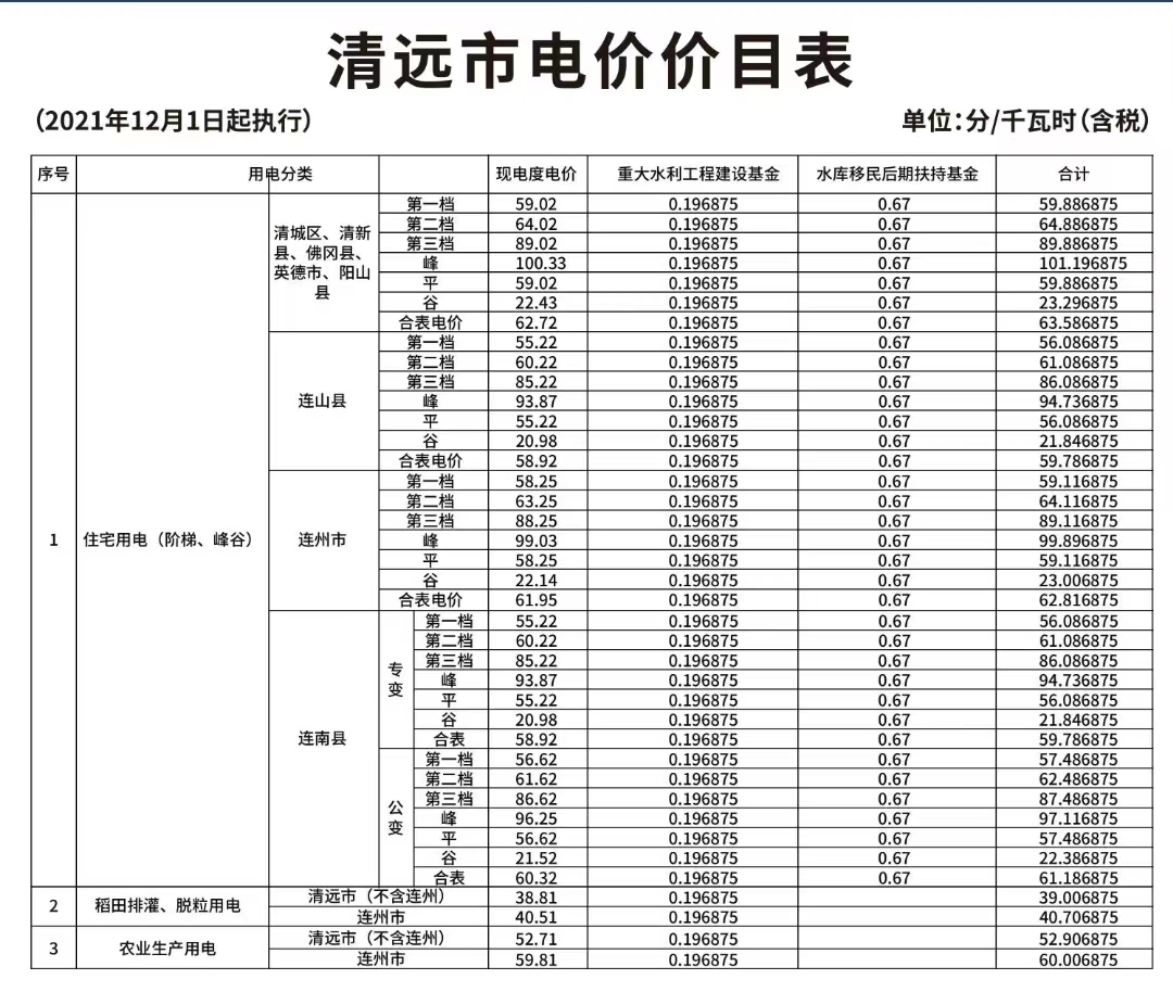 清远各地电价存在差异