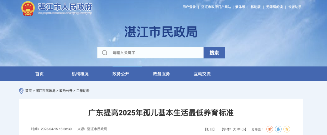 2025年,湛江市及全省集中供养孤儿基本生活最低养育标准为2375元/人·月,散居孤儿(含艾滋病病毒感染儿童)基本生活最低养育标准为1536元/人·月;集中供养、散居事实无人抚养儿童分别按照集中供养、散居孤儿的养育标准执行。