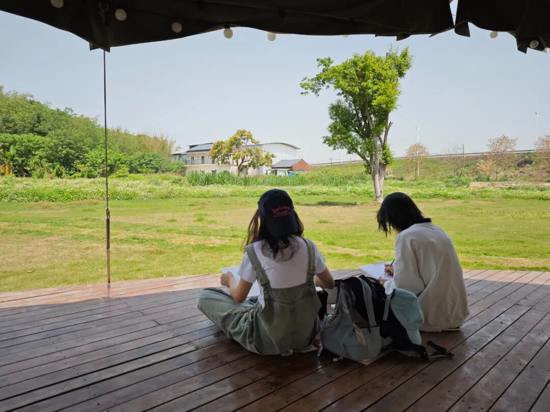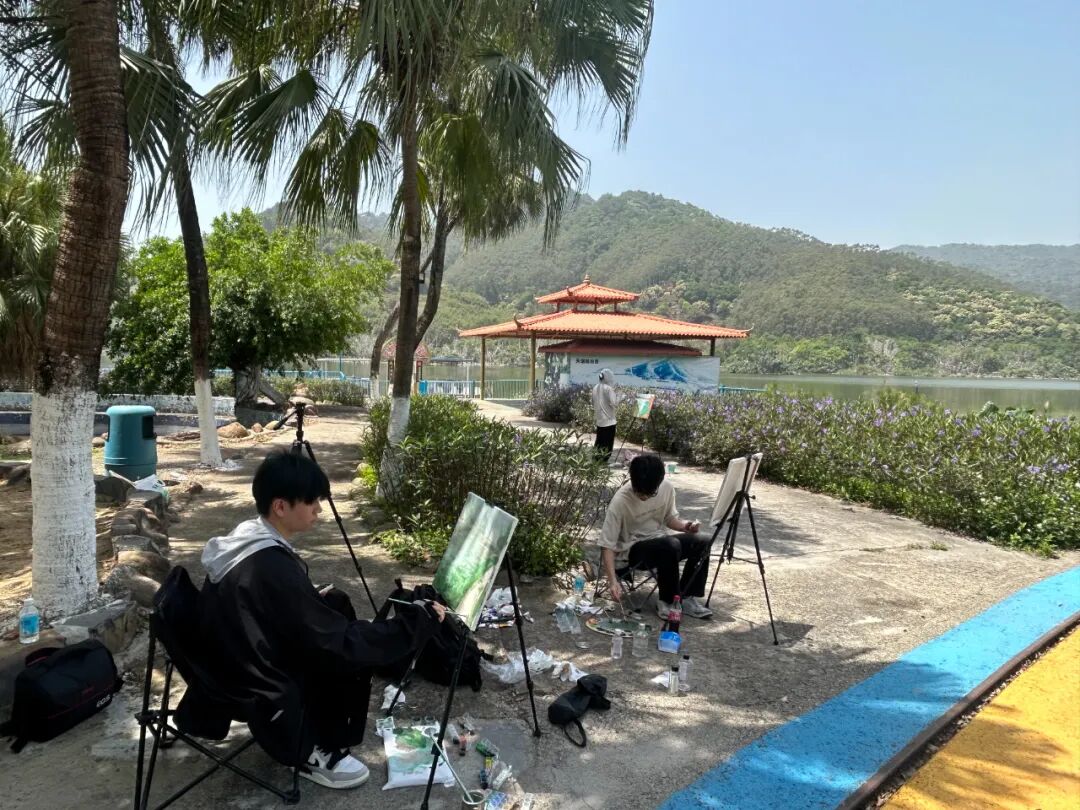启动仪式后,师生们兵分多路,深入沙浦革命烈士纪念碑公园、黄布沙村、蒲营·鼎湖沙浦民宿、天湖生态邨等标志性点位。初夏的沙浦镇,岭南水乡风貌尽显:碧水环绕村落,白鹭掠过浅滩,青砖古巷与现代民宿相映成趣,构成了天然的“艺术课堂”。同学们或席地而坐专注速写,或支起画架细描光影,以素描、水彩等多元形式,将古村肌理、生态湿地、红色地标等元素转化为灵动的艺术作品。