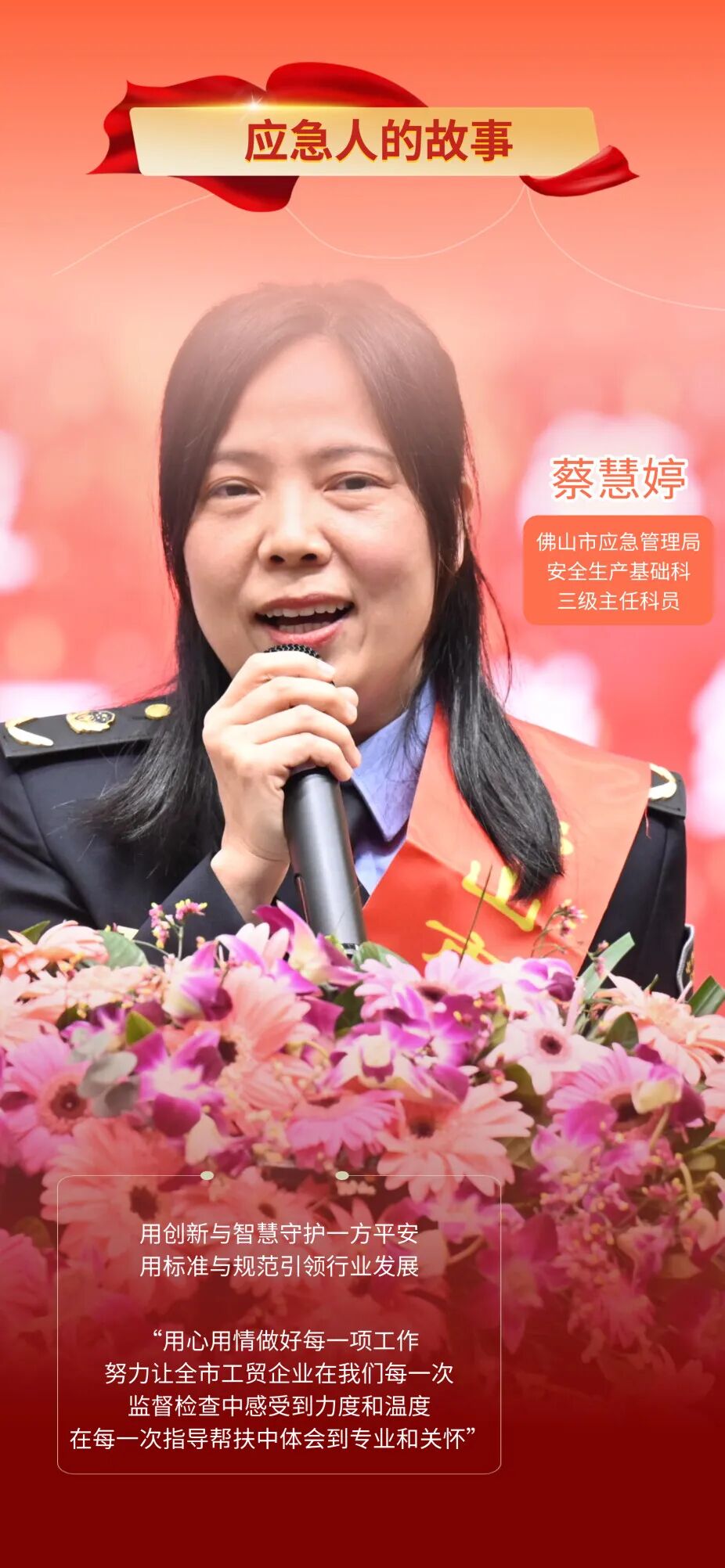 “用心用情做好每一项工作,努力让全市工贸企业在我们每一次监督检查中感受到力度和温度,在每一次指导帮扶中体会到专业和关怀。”在工作中,蔡慧婷始终坚持以诚心、恒心诠释对应急管理事业的追求和坚守,努力将所学知识运用到实际工作中,为应急管理事业的发展贡献更多的智慧和力量。2023年4月,经中共佛山市委组织部批准,蔡慧婷获记三等功一次;2023年11月,荣获佛山市“平安佛山”建设先进个人称号。