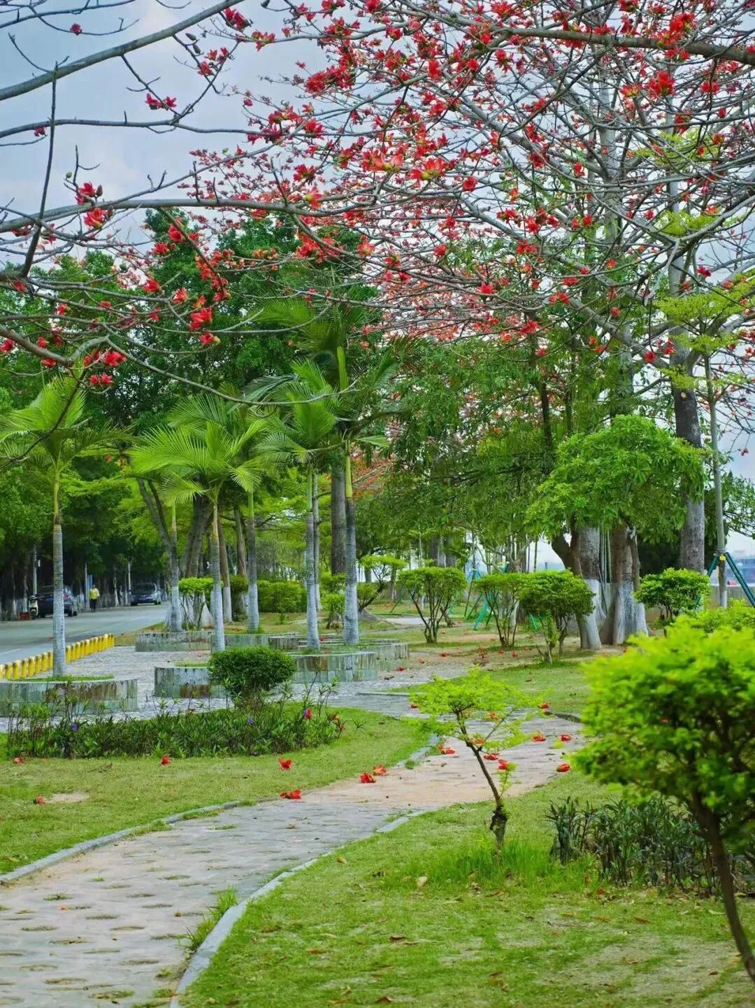沿江处有几棵火红的木棉花竞相绽放