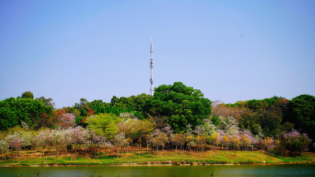 春日的宫粉紫荆沿湖盛放