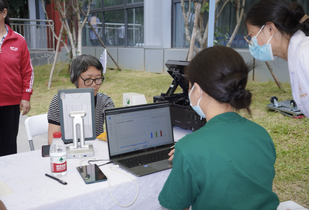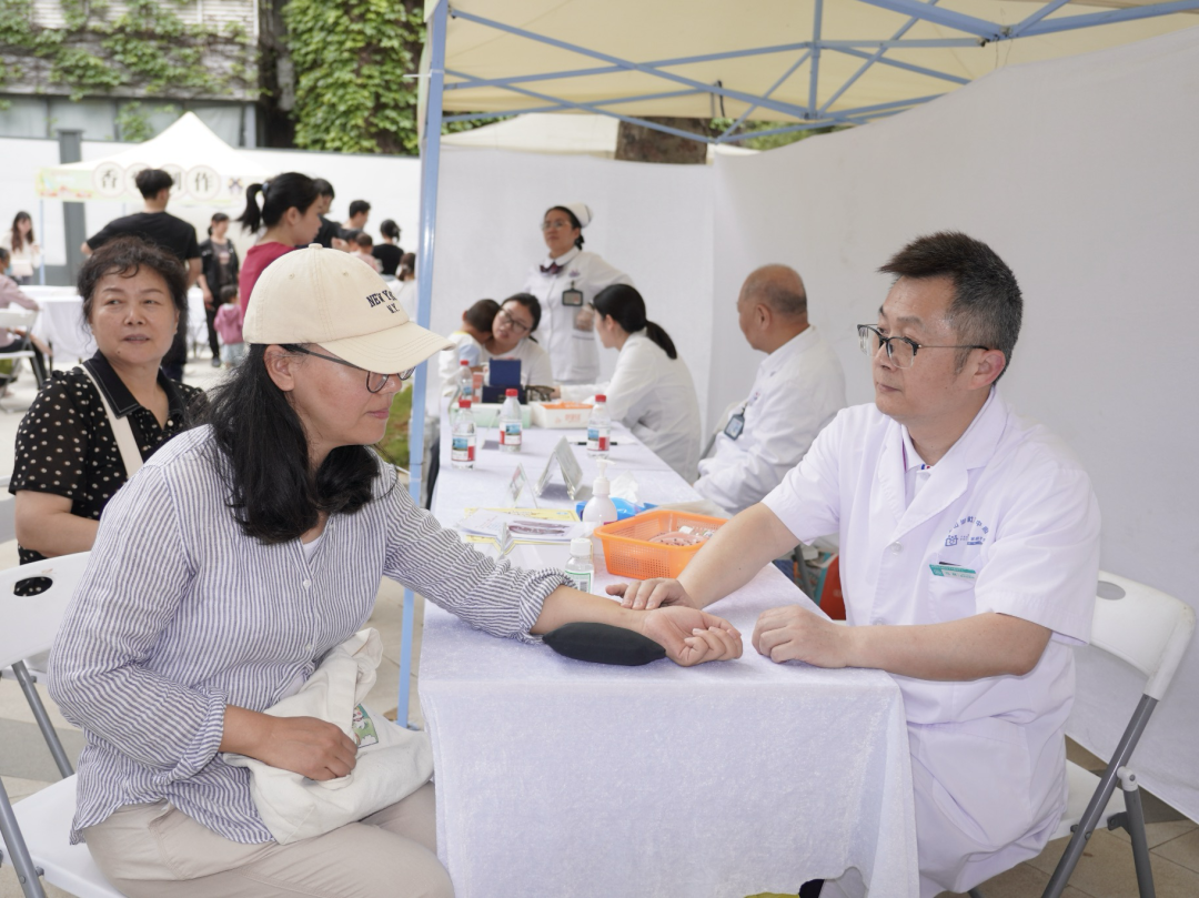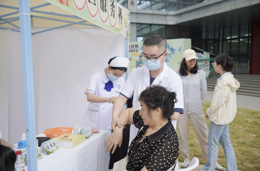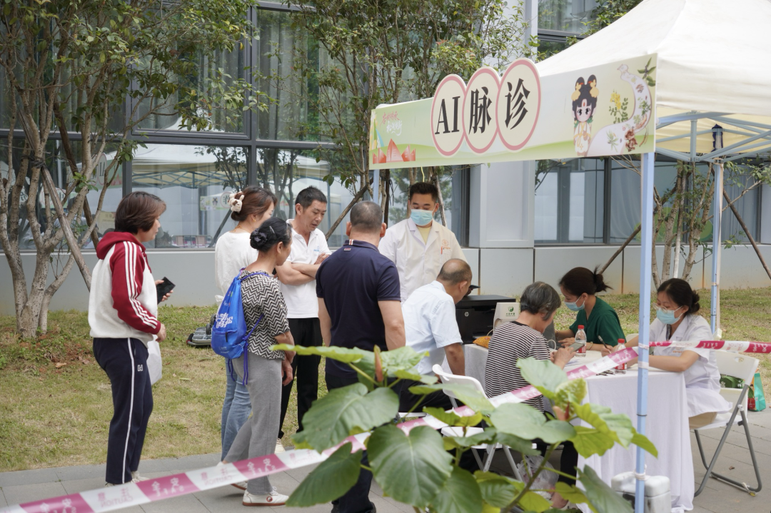 本次活动现场便设有“AI脉诊”“中医服务”“香囊制作”等互动体验区,吸引社区居民踊跃参与。在其中的“中医服务”区域中,针灸、火龙罐、毫火针、耳穴压豆等摊位人头攒动。多位中医名医现场出诊,为到场居民提供免费健康诊断及咨询服务。