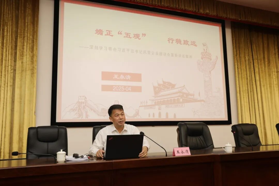 王永清围绕“端正‘五观’ 行稳致远",要用大历史观看当下,保持发展定力、增强发展信心,坚决打赢关税战;要用大科学观驭未来,深刻理解新质生产力的新在何处、质从何来以及新要求,坚定不移走高质量发展之路,推动科技创新、培育新质生产力、建设现代化产业体系;要用大统战观建组织,用好“三大法宝”,认真落实各项纾困政策,破除依法平等使用生产要素、公平参与市场竞争的各种障碍,促进公平竞争,依法保护民营企业和民营企业家合法权益,营造良好营商环境;要用大文明观稳财富,坚决查处各类所有制企业的违法行为,进一步构建亲清政商关系;要用大责任观挑大梁,胸怀报国志、一心谋发展、守法善经营、先富促共富。积极履行社会责任,构建和谐劳动关系,抓好生态环境保护,力所能及参与公益慈善事业,多向社会奉献爱心。