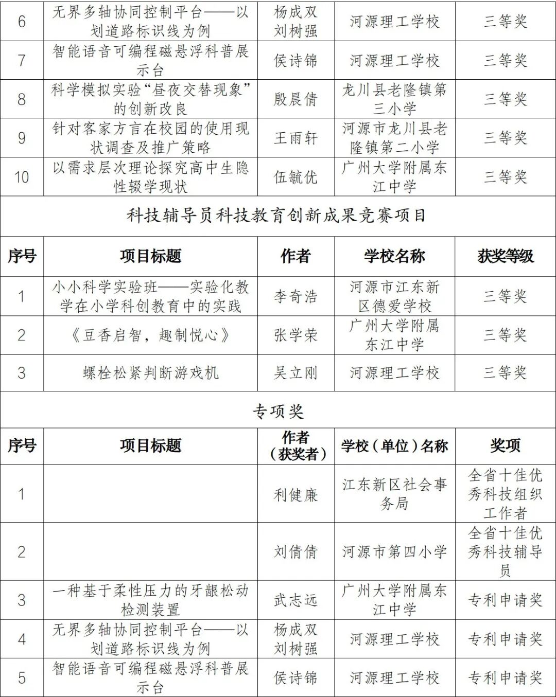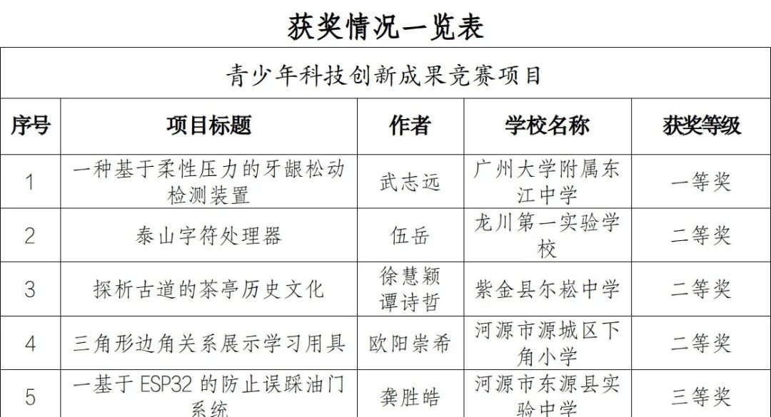 本届大赛河源市选送参赛项目13项,其中,青少年科技创新成果竞赛项目10项、科技辅导员科技教育创新成果竞赛项目3项。参赛过程中,选手们沉着冷静、从容应对,取得了优异成绩,其中,青少年科技创新成果竞赛项目获一等奖1项、二等奖3项、三等奖6项,科技辅导员科技教育创新成果竞赛项目获三等奖3项,获专项奖5项(获奖情况见附表)。