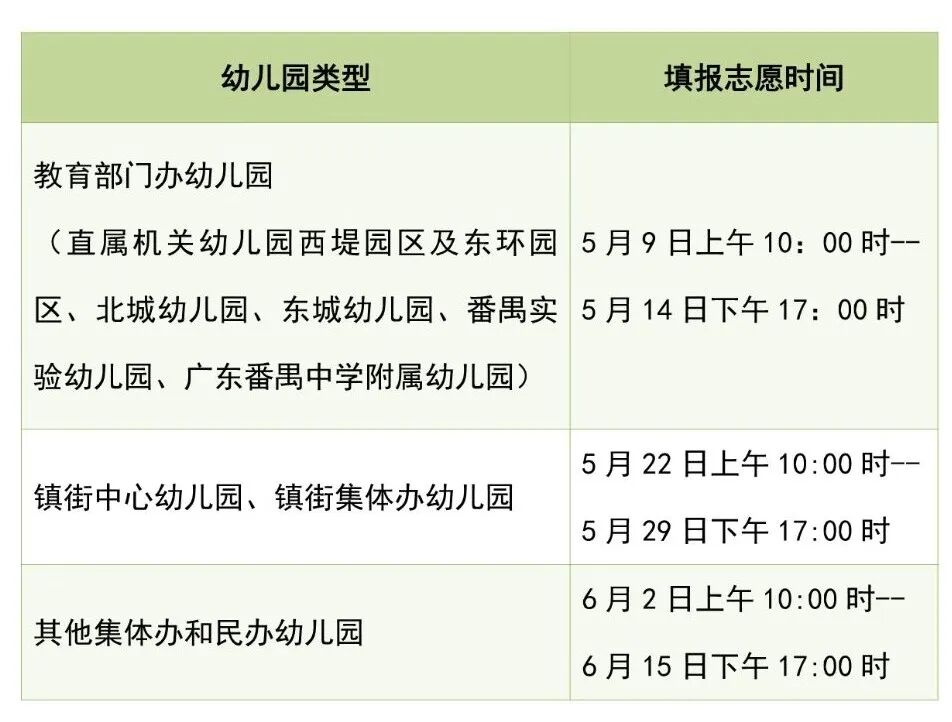 幼儿园填报志愿时间原则上为每年5月,具体安排详见下表:
