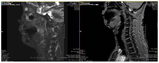 MRI影像可见:左侧颊部见不规则软组织信号影,病灶边界不清,大小约21mm×14mm×18mm,T1W1等信号,T2W1高信号,DW1稍高信号,ADC稍低信号,提示弥散受限,增强扫描呈中度不均匀强化,邻近骨质未见异常信号影,左侧颊部肿胀,T2W1稍高高信号;鼻咽、口咽大小、形态如常,其内未见明显异常信号影;包入区双侧筛实、上颌实黏膜稍增厚,双侧下鼻甲肥大。
