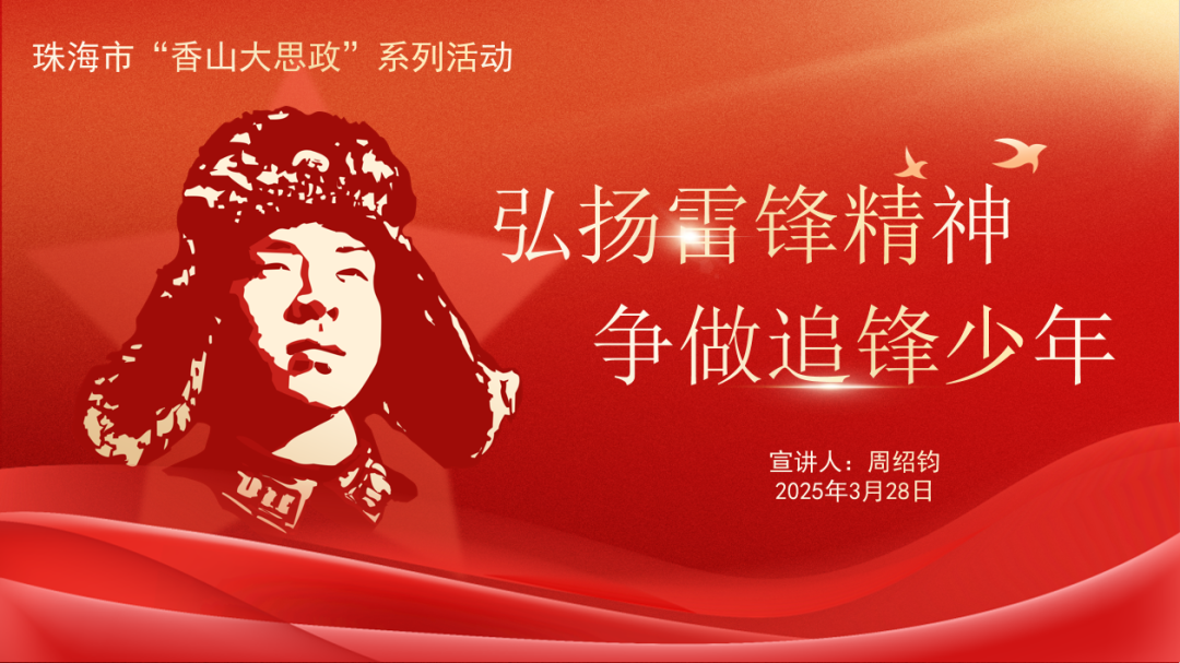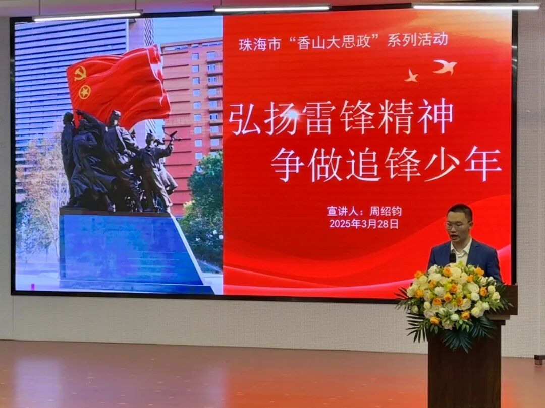 2025年3月28日,珠海市三灶镇中心小学举办“香山大思政”暨“榜样为我赋能成长”活动。本次活动邀请“中国大学生自强之星”“粤港澳大湾区杰出志愿者”“广东最美志愿者”“珠海好人”“珠海市最美志愿者”“珠海市最美青年志愿者”周绍钧作为授课嘉宾,为珠海市三灶镇中心小学师生带来一堂以“弘扬雷锋精神,争做追锋少年!”为主题的讲座。