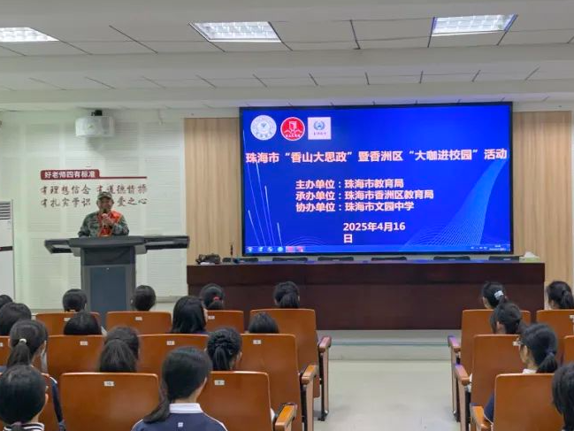 2025年4月17日,珠海市委常委、珠海警备区政委占克峰大校莅临珠海市第一中学开展“香山大思政”暨国防教育宣讲活动,主题为《热血青春护山河 复兴伟业勇担当 新时代青年的家国使命》。