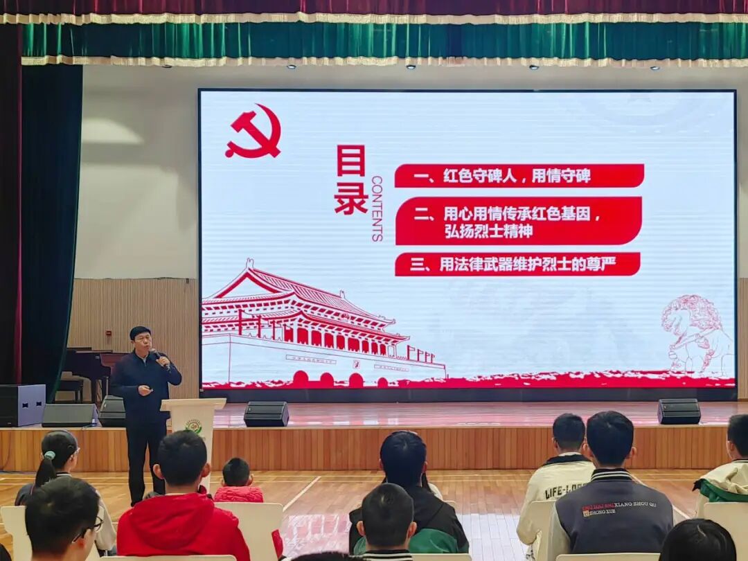 徐主任围绕红色守碑人用情守碑、用心用情传承红色基因、用法律武器维护烈士尊严三个方面,通过丰富的视频图片资料以及真实案例,生动形象地讲述了参与仪仗队和红色守碑人的人生经历,以及革命战争时期的感人故事,让同学们更直观地感受革命先烈的英勇事迹,引导同学们保护烈士尊严免遭侵犯,在缅怀英烈中汲取精神力量,铭记历史使命,努力学习,积极进取,在守护初心中践行青春使命。