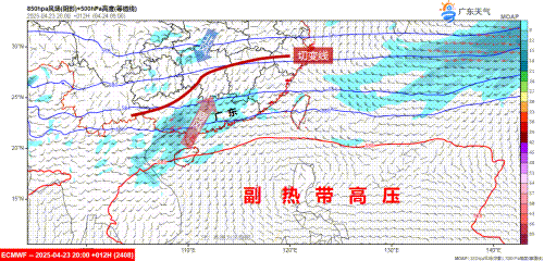 到了后天(26日),随着副热带高压再次加强西伸,低层转为顺畅的南风,我省降雨将会短暂减弱,以阵雨为主。